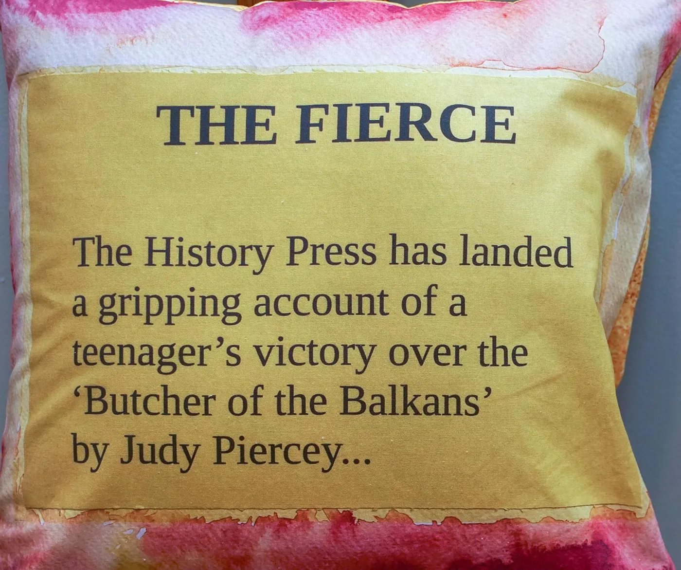 Touchstone Number Five: Throw Pillow with custom text. It has the title of my book, The Fierce, in a bold headline. The text reads: The History Press has landed a gripping account of a teenager’s victory over the ‘Butcher of the Balkans’ by Judy Piercey….